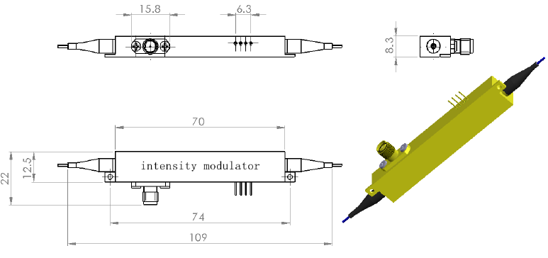 Электрооптические модуляторы интенсивности серии KG-AM-20 на ниобате лития с длиной волны 2050 нм, выполненные на основе структуры Маха-Цендера. Они характеризуются низкими вносимыми потерями, широкой полосой модуляции и низким полуволновым напряжением. Полоса пропускания составляет 1/10 ГГц (в зависимости от модели). Доступны варианты входного и выходного оптического волокна — PM/SMF или PM/PMF, а также тип коннектора — FC/APC, FC/PC или по запросу. Модуляторы в основном применяются в оптических линиях связи, генераторах импульсов, аналоговой оптической модуляции и других областях.