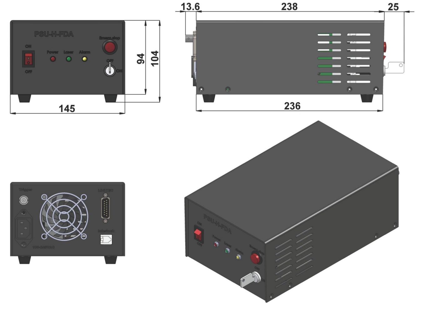 Поставляется в комплекте с блоком питания PSU-H-FDA, который обеспечивает стабильную работу всей системы. Устройство рассчитано на эксплуатацию при рабочей температуре от 10 до 35°C и требует не более 10 минут для прогрева, после которого стабильность направления пучка составляет ≤50 мкрад.