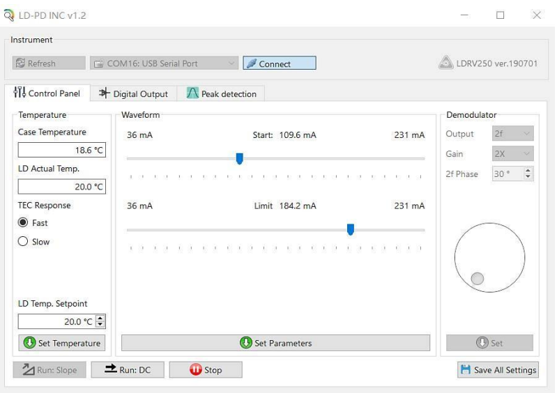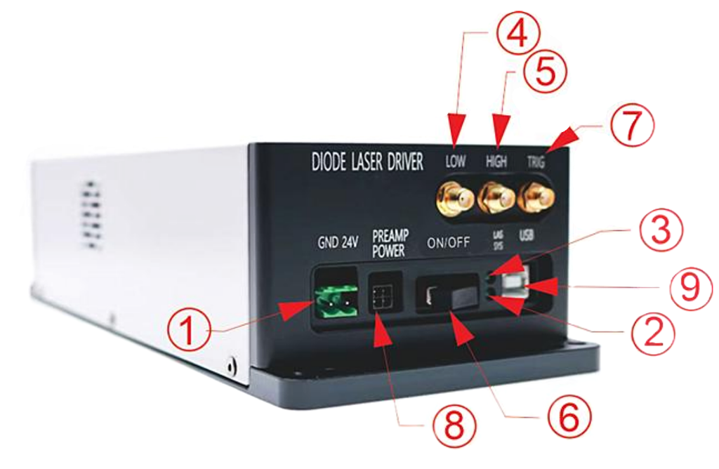 Лазерный диод и его выходное волокно устанавливаются внутри прибора, что исключает необходимость внешних соединений. Все параметры устройства доступны для настройки и контроля через интерфейс USB 2.0.