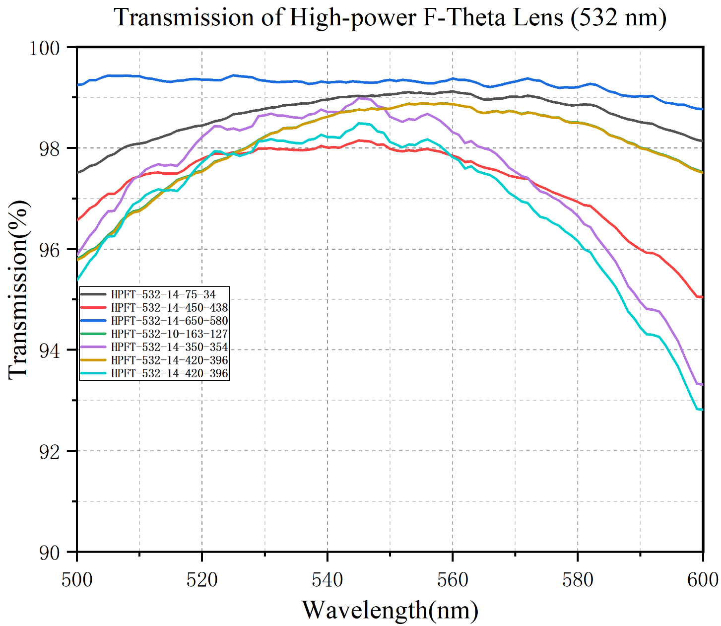 Объективы серии HPFT-532 представляют собой F-Theta сканаторы, специально разработанные для работы с лазерами зеленого диапазона с длиной волны 532 нм. Оптическая система изготовлена из ультрафиолетового плавленого кварца, что обеспечивает высокий порог лазерного повреждения и оптимальное пропускание в целевом диапазоне.