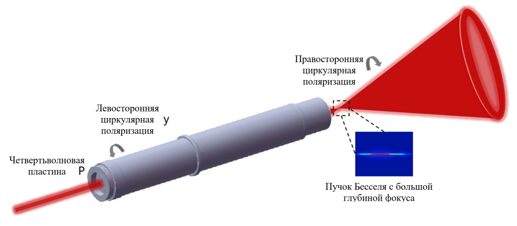 В основе работы модулей BPH лежит комбинация дифракционных и преломляющих оптических элементов, интегрированных в единый металлический корпус. Дифракционный оптический элемент – аксикон – генерирует начальный бесселев пучок, а телецентрическая оптическая система выполняет его окончательное формирование, регулируя угол расхождения и уменьшая диаметр центральной доли. На входе модуля установлена четвертьволновая пластина в поворотном держателе, которая преобразует линейно-поляризованное входное излучение в циркулярно-поляризованное, что является необходимым условием для эффективной работы дифракционного аксикона и формирования качественного бесселева пучка.