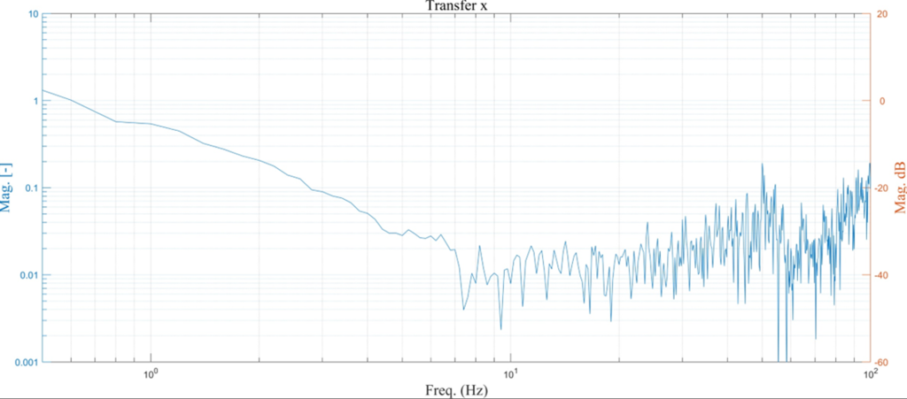 Активные виброизоляционные платформы демонстрируют превосходные характеристики гашения вибраций, достигая уровней стандартов VC-E и VC-F. Кривая передаточной функции (коэффициента передачи вибраций) активной виброизоляционной платформы представлена на рисунке ниже. Данный график наглядно иллюстрирует эффективность подавления вибраций в широком частотном диапазоне.
