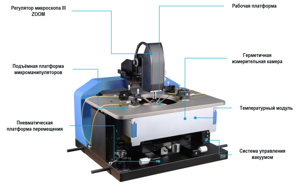 Оптическая система станции оснащена трехступенчатым микроскопом с коэффициентом увеличения 11:1, позволяющим одновременно наблюдать области с низким и средним увеличением. Встроенные цифровые камеры с разрешением до 5 Мп обеспечивают документирование результатов измерений. Пневматический механизм подъема микроскопа на 50 мм облегчает смену объективов, а платформа микроманипуляторов обеспечивает точное позиционирование зондов с механическим разрешением до 0,1 мкм.