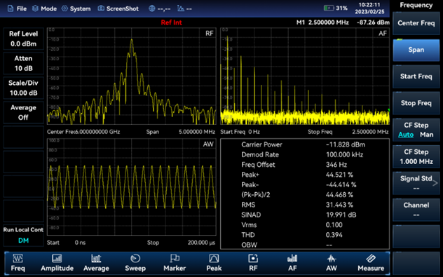 Анализаторы спектра 4025 оснащены широким набором измерительных функций, некоторые из которых продемонстрированы ниже. Кроме того, они поддерживают различные интеллектуальные измерительные функции, включая определение мощности канала, ширины занимаемой полосы пропускания, мощности в соседних каналах, спектральной маски излучения, отношения несущей к шуму, гармонических искажений, а также поддержку развёртки по списку и других возможностей.