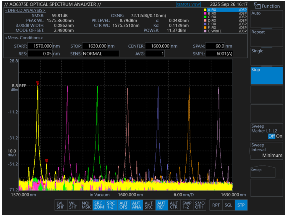 Широкополосный усилитель, встроенный в лазерный модуль, генерирует излучение, а перестраиваемый элемент внутри резонатора осуществляет селекцию длины волны. Такая конструкция обеспечивает узкую ширину спектральной линии, высокую стабильность и возможность перестройки в пределах C-диапазона (1524,50 - 1572,06 нм) и L-диапазона (1570 - 1630 нм).
